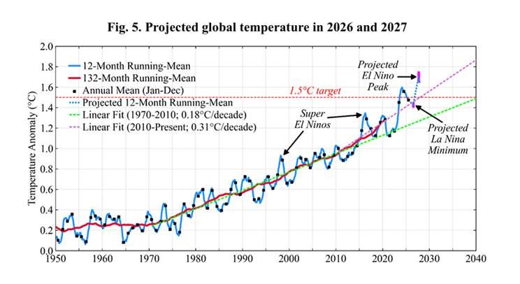 Figure 2. The Hansen projection anticipates global temperatures reaching +1.7 degrees C in 2027, driven by a new El Nino.